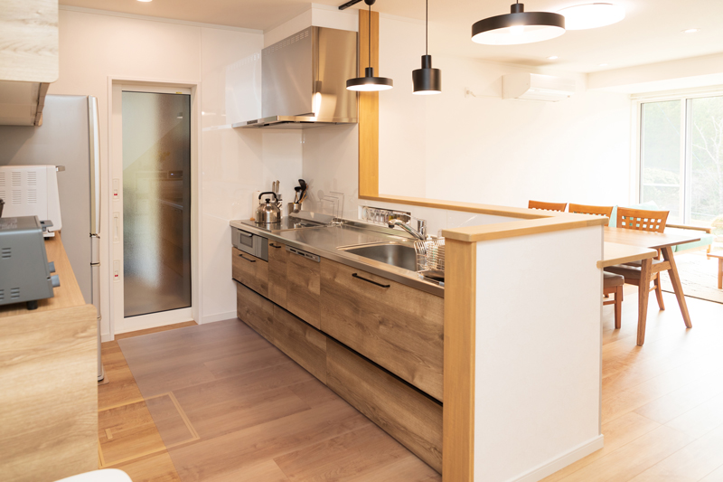 既存は和風で木質素材が多く見える内装でしたが、シンプルモダンな雰囲気の色合いの内装をご提案致しました。カウンターを設置し、お料理をしながら家族とコミュニケーションが深められる空間に生まれ変わりました。