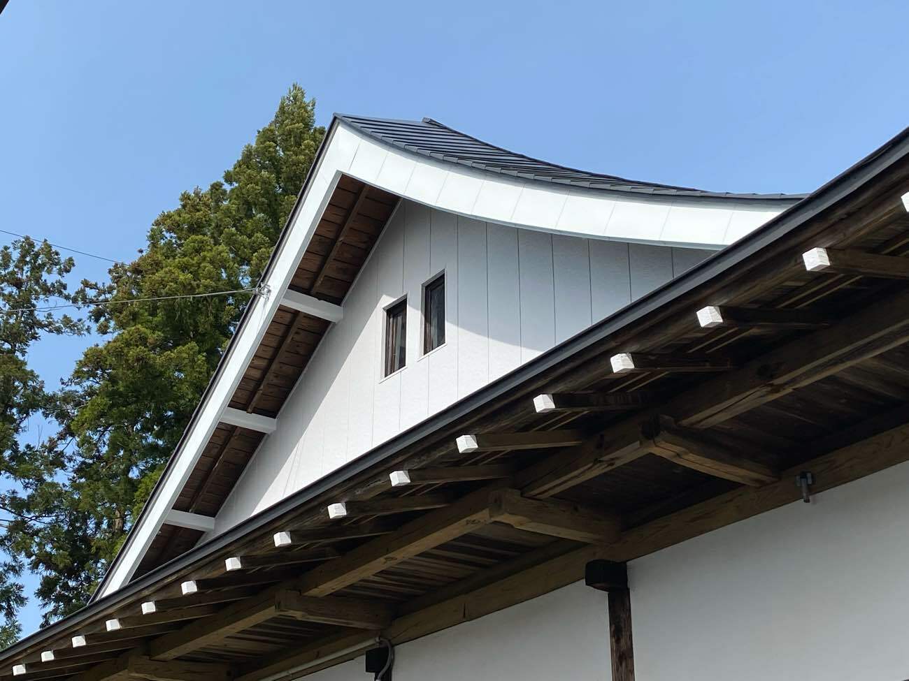 | 母屋屋根葺き替え、化粧垂木木部塗装、妻壁 金属サイディング施工 |
