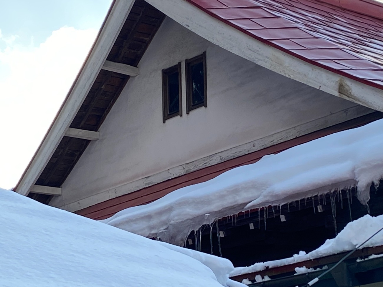 積雪荷重に強く、仕上がりや見栄えも良い、定尺横葺き屋根をご提案致しました。母屋屋根の葺き替え、化粧垂木木部塗装、妻壁は金属サイディング施工をしております。