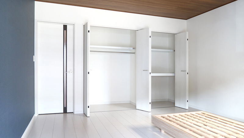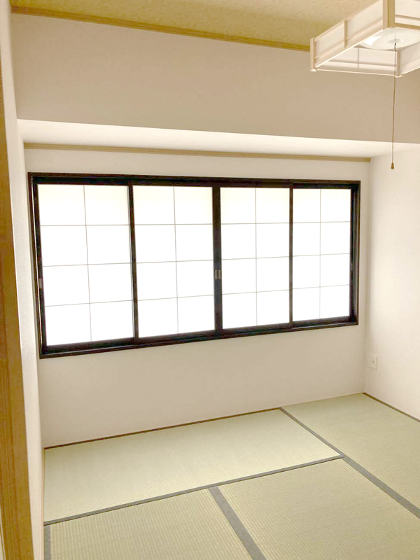 天井はクロスではなく、建材で仕上げる事・白ベースの壁1面のみ壁の色を変えるなどで現代的な空間に仕上げました。窓は最大限大きい掃き出し窓を使って採光をとり、プライベート確保の為に一部を曇りガラスにて施工とするご提案を致しました。