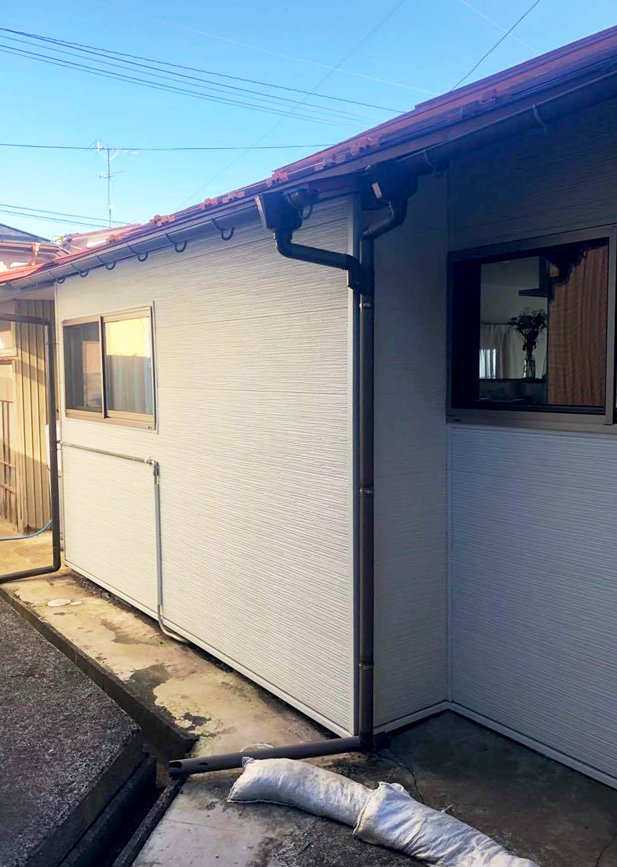 既存は角波トタンが主で経年劣化が進んでおりました。金属サイディング重ね張りをご提案致しました。