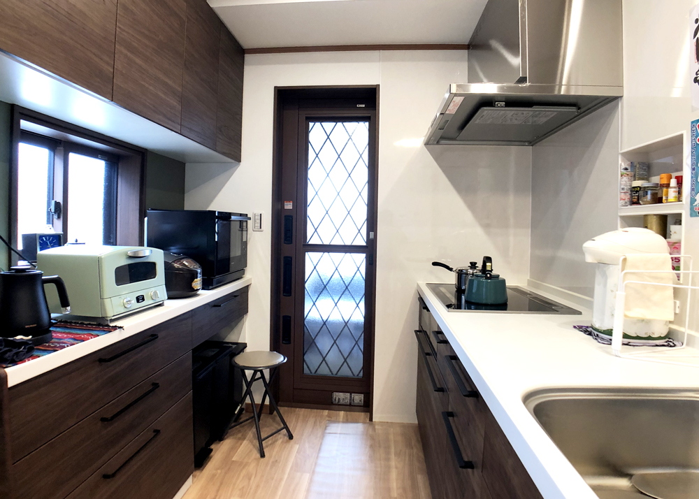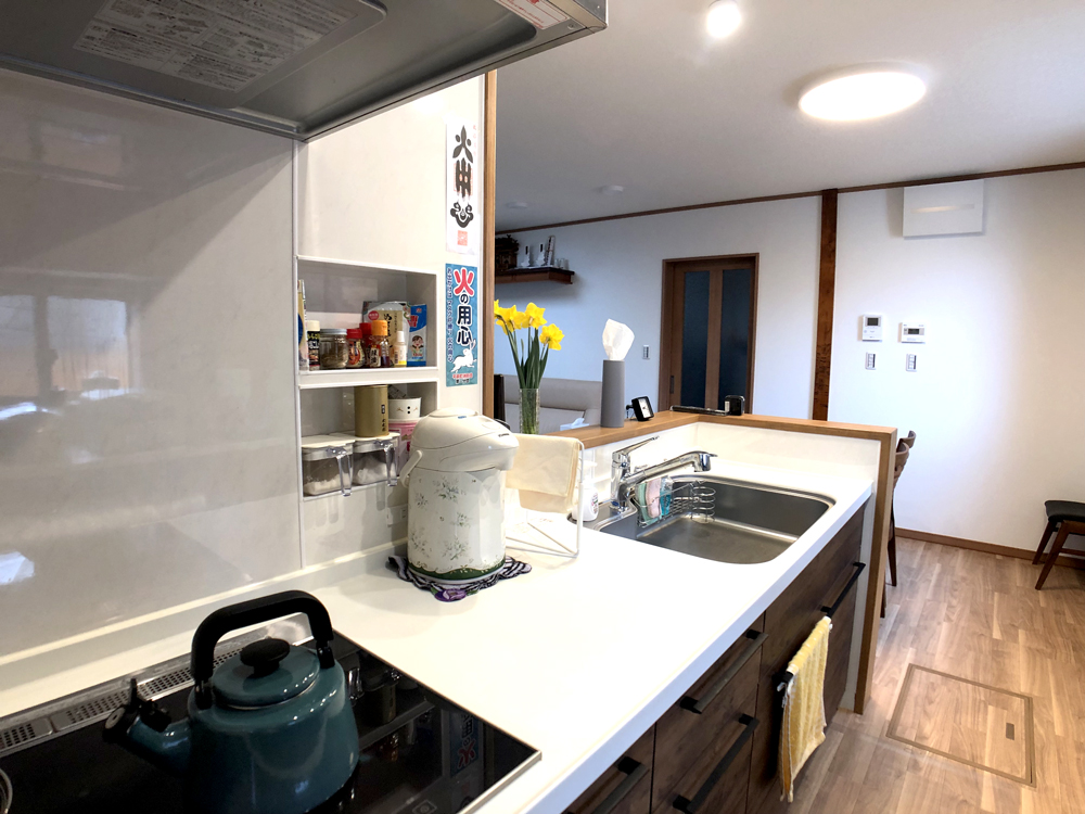 居間とキッチンが仕切られているため、家族で集まった時に離ればなれになってしまうことがお悩みでした。リビングから見えるところなのでキッチンと収納を統一するご提案を致しました。