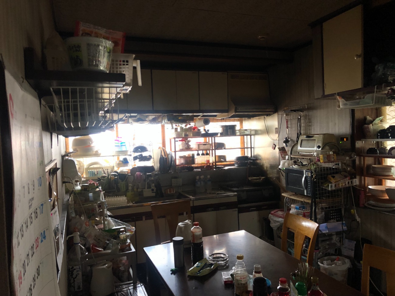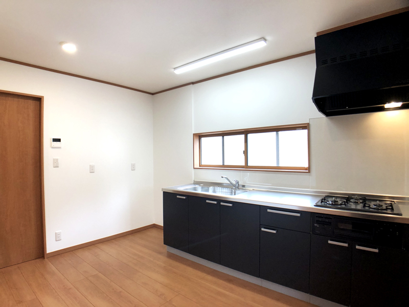 減築によりスペースは縮小していますが、キッチンを壁付けにして広く見えるようご提案致しました。 窓は国道に面しているため、視線が気にならないようすりガラスにしています。