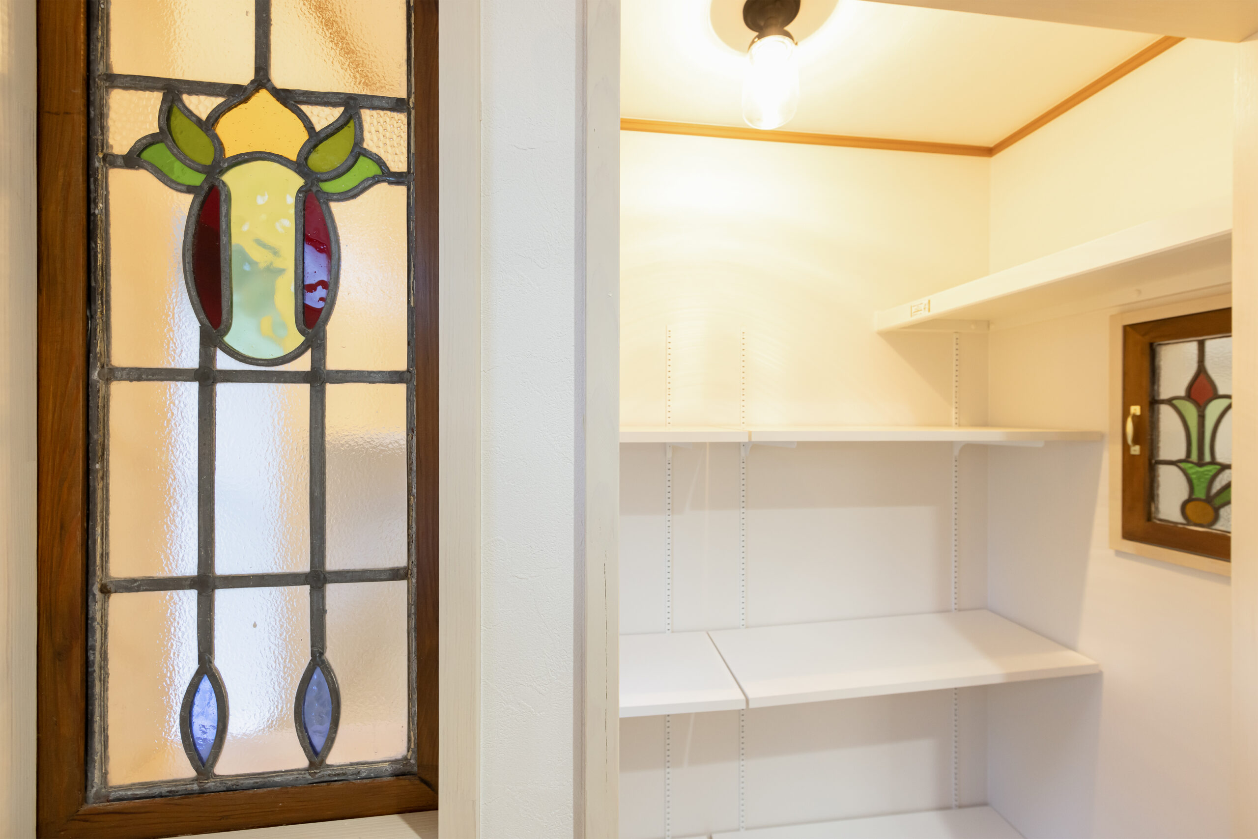 ・奥様が趣味で集められていた、照明やステンドグラスをキッチンやパントリーに採用した。