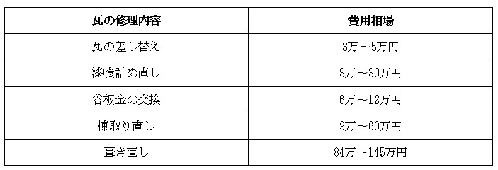 具体的に瓦を補修する場合の費用の相場をみていきましょう。
